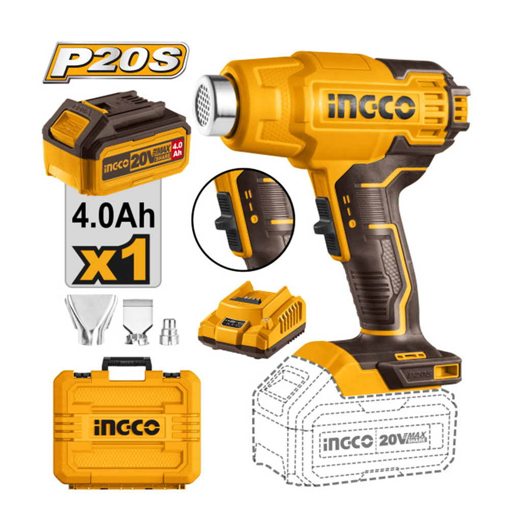INGCO Akkus hőlégfúvó 550°C 20 V (1 x 4,0 Ah akku + töltő)