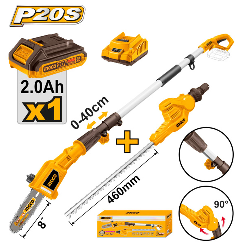 INGCO Akkus magassági sövény 460 mm és ágvágó 200 mm 0-400 mm 20 V (1 x 2,0 Ah akku + töltő)