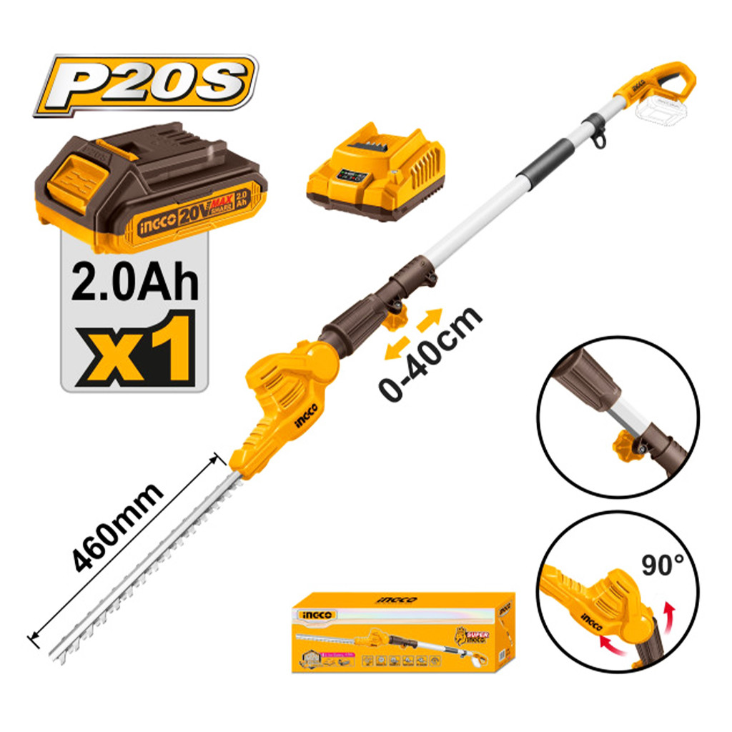 INGCO Akkus magassági sövényvágó 0-400 mm 460 mm 20 V (1 x 2,0 Ah akku + töltő)