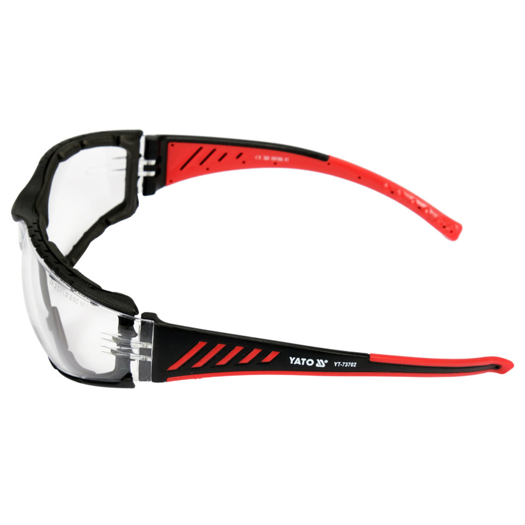 A YT-73702 védőszemüveg tiszta lencsékkel rendelkezik, melyek kényelmes keretbe vannak foglalva. A lencséken párátlanító és karcolásálló* bevonat található. Az előbbi megakadályozza a szemüveg párásodását, az utóbbi pedig a túlzott karcolódás ellen véd. A legmagasabb optikai osztályú szemüvegek nem torzítják a képet, és a káros UV sugárzás ellen is védnek. A kereteket levehető EVA hab kerettel látták el, amely csökkenti a szem körüli kemény elemekkel való érintkezést. Mindössze 31 grammot nyomó és lágy, rugalmas, csúszásmentes szárvégekkel ellátott szemüveg alig érezhető a fejen.
