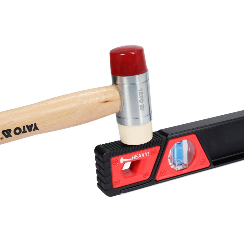 Robosztus, ütésálló alumínium szintező. A két nagy fogantyú segítségével könnyedén elvégezhetőek a mérések. A szintező végét rugalmas, ütésálló puferek védelmezik, lehetővé téve a kalapáccsal való ütögetést. A szintező három buborékkal rendelkezik: függőleges, vízszintes, 45 fokos. Az esztergált alapon 5 mágnes található.