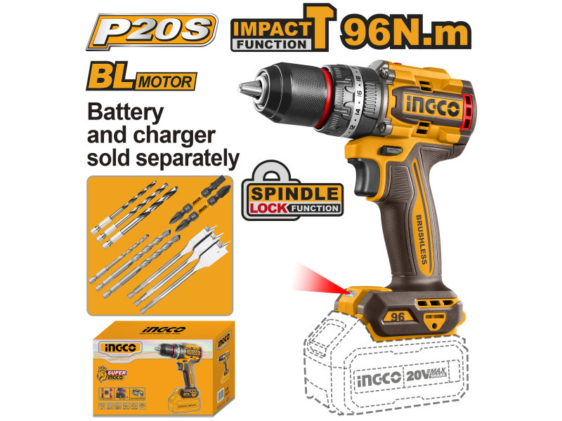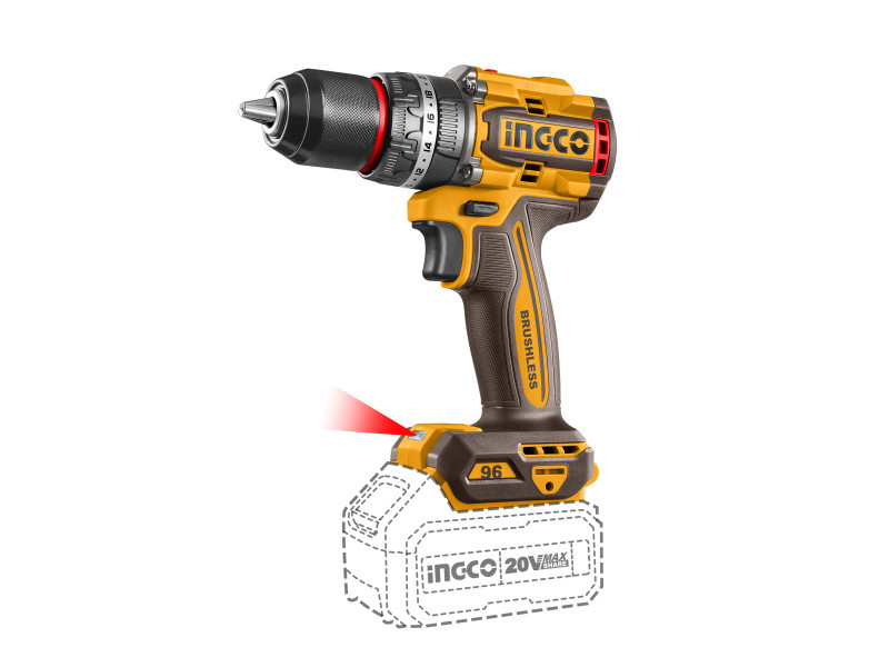INGCO Akkus ütvefúró-csavarozó 96 Nm szénkefe nélküli 20 V (akku és töltő nélkül)